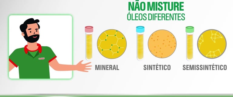 Misturar diferentes tipos de óleo pode gerar incompatibilidades químicas que comprometem a lubrificação do motor, causando desde aumento de atrito até falhas graves. Se precisar trocar de tipo de óleo, faça a troca completa e substitua também o filtro.